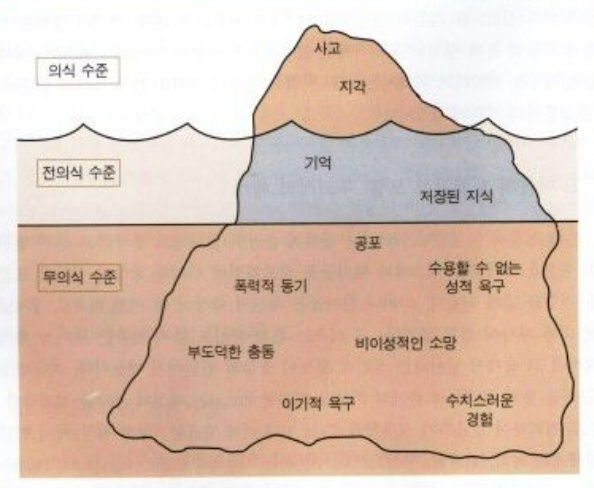 마지막으로, 무의식 수준(unconscious level)은 자각하려는 노력에도 불구하고 쉽게 의식되지 않는 다양한 심리적 경험을 포함한다. 이러한 무의식은 수용되기 어려운 성적 욕구, 폭력적 동기, 부도덕한 충동, 비합리적 소망, 수치스러운 경험과 같이 의식에 떠오르면 위협적인 것으로 느껴지기 때문에 억압된 욕구, 감정, 기억의 보관소라고 할 수 있다. Freud는 정신세계를 빙산에 비유하면서 [그림 2-1]과같이 그 대부분은 무의식의 수면 아래 잠겨 있다고 주장했다. 이러한 무의식은 의식에 잘 떠오르지 않지만 개인의 생각과 행동에 지대한 영향을 미친다는 점에서 중요한 의미를 지닌다.